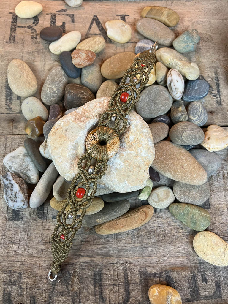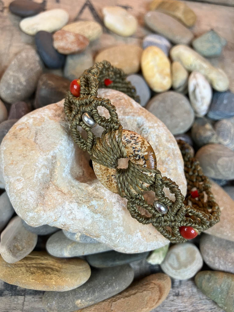 Bracelet micro-macramé kaki, tissé autour d’une pierre jaspe paysage, et agrémenté de perles en acier inoxydable et céramique rouge.
