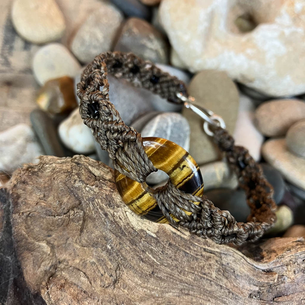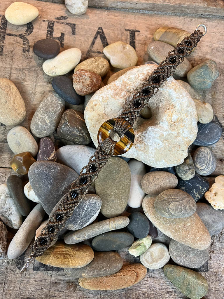 Bracelet micro-macramé brun, tissé autour d’une pierre œil de tigre, et agrémenté de perles en verre noires.